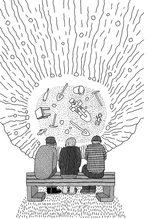 После обеда в детскую забежал Малой. Он покрутился возле своего простенького стола, разгрёб сваленные в кучу тетради и отыскал альбомный лист, на котором по заданию учителя нарисовал отца в защитном костюме и с поднятым на плечо пневматическим отбойным молотком. Бережно разгладил заломившийся уголок, кинулся обратно к двери, но задержался, чтобы выудить из шкафа шкатулку-головоломку. Опустившись на ковёр, без успеха подёргал деревянные стержни, с силой надавил на кнопку, после чего переключился на склеенный из спичек сваебойный копёр. Андрей почти закончил копёр и только подыскивал ветку, чтобы выстругать длинную сваю. Малой ещё минуту повозил по узорам ковра игрушечные самосвалы, затем его позвала мать, и он, прихватив альбомный лист с рисунком, убежал.