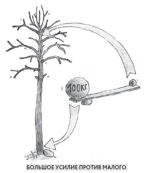 Про хворост и мелкие ветки говорить нечего, они никогда не требовали пилы. Сложность возникнет при заготовке сушины. Тут поможет хитрость, которую называют «метод Архимеда». Не знаю, довелось ли древнегреческому учёному бродить в наших лесах и валить голыми руками деревья, ведь Архимеда больше заботила идея перевернуть Землю, но в нашем случае пригодится его излюбленный принцип рычага. Сушина подгнивает с корня – в том месте, где она постоянно соприкасается с влажной землёй. Чтобы далеко не отходить от греческой истории, скажу, что это её ахиллесова пята. Порой достаточно навалиться на ствол, и он сразу сломится на корню. Если вы в последние годы не усердствовали в поедании блинчиков с малиновым вареньем, вам, скорее всего, не хватит для этого веса. Принцип рычага значительно увеличит вашу силу, благодаря ему вы получите большое усилие на коротком конце при малом усилии на длинном. В нашем случае коротким концом будет комель – нижняя часть сушины.