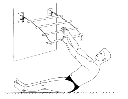 УПРАЖНЕНИЕ 1. Переход из положения лежа в положение сидя хорошо тренирует мышцы живота. Но многим больным как раз это делать трудно. Если подвесить через блоки груз, то мышцы живота будут работать в облегченном режиме. При этом станут больше нагружаться мышцы спины: чтобы лечь обратно, придется преодолеть сопротивление груза. При возможности нужно обращаться к грузу попеременно то лицом, то спиной и качать разные группы мышц.