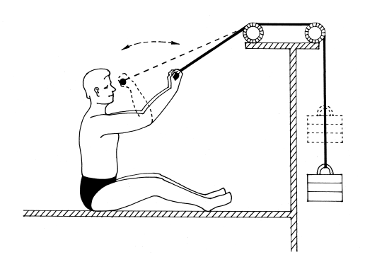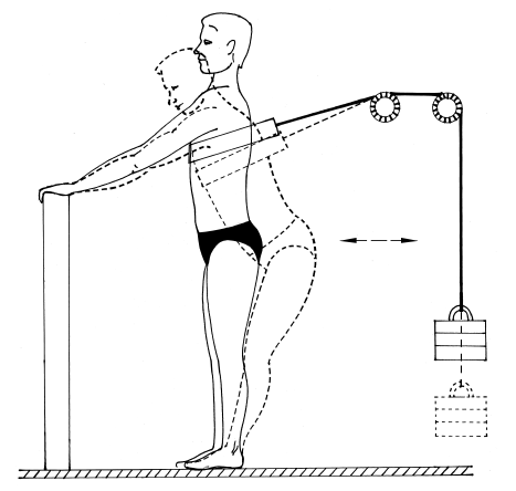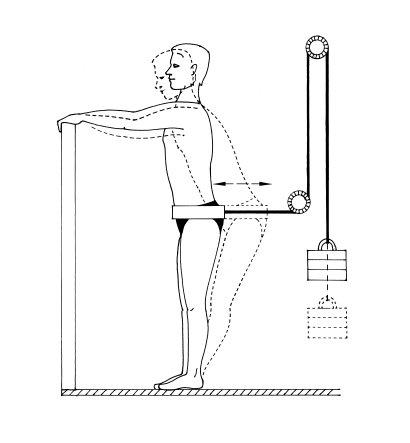 УПРАЖНЕНИЕ 7. Тросик от груза, пропущенный через два блока, закрепляется на коленях ременной петлей, затем коленями выполняются движения вперед-назад.