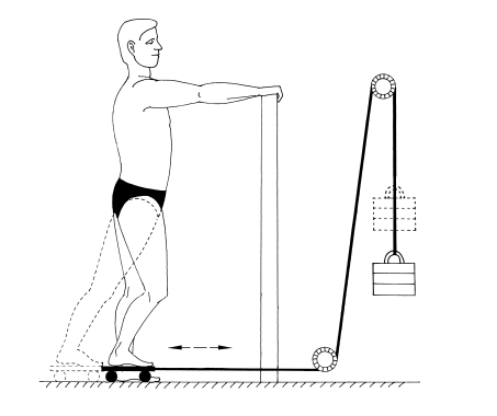 УПРАЖНЕНИЕ 10. Требуется несколько усовершенствовать тренажер – изготовить подвижную тележку или подставку на роликах. Стоим на одной ноге, а второй тянем на себя тележку, к которой прикреплен груз.