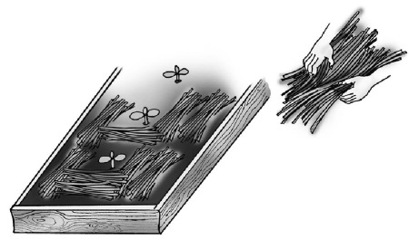Разгрести в куче лунки до самой земли и воткнуть в каждую по два сухих семечка ребром, заглубив в почву на 2 фаланги пальца. Не засыпать сверху!