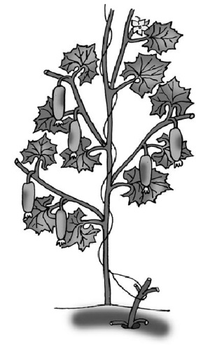 Если этого не делать, будут сплошные джунгли из стеблей и листьев, среди которых только кое-где будут проглядывать огурчики. Урожай резко падает при загущении посадок огурцов. Как только вы перекинете стебли огурцов через горизонтальную шпалеру (проволоку), прекратите делать прищипку боковых побегов, концы их разветвятся, и на этих ответвлениях плодоношение будет гроздьями, то есть несколько огурчиков из одного места. Существуют сорта и гибриды, плодоносящие пучком по всему стеблю.