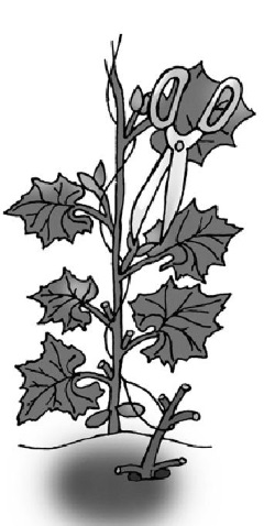 Обрезать боковые плети начиная с 5-го листа до верхней горизонтальной шпалеры, чтобы не образовалась излишняя зеленая масса и не снизился урожай. Нижнюю часть стебля (40 см) оставить голой.