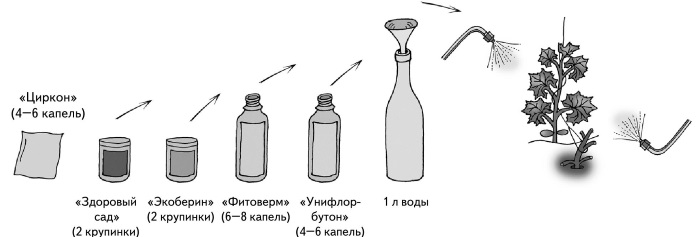 Влажность воздуха и почвы не должна превышать 90 %. Обычно рекомендуют опрыскивать заболевшие растения бордоской жидкостью (1 чайная ложка на 5 л воды), но в теплицах ее применение нежелательно, потому что в течение 20 дней нельзя будет употреблять огурцы в пищу. Лучше применяйте «Фитоспорин», «Циркон» или настой чеснока (200 г нарезанных листьев и стрелок чеснока залить 5 л воды, накрыть, дать настояться 4 часа и сразу опрыскивать листья снизу). Чаще проветривайте теплицы, сократите полив, подкормите огурцы настоем свежего навоза или настоем сорняков, дайте дополнительно калийную подкормку. Хороший результат дает профилактическое опрыскивание здоровых листьев «Эпином-экстра» или «Новосилом» («Силком»). Но лично я пользуюсь защитным коктейлем для растений: 2 крупинки «Здорового сада», 2 крупинки «Экоберина» надо растрясти до полного растворения в 100 мл воды, добавить еще 900 мл воды, чтобы получился один литр раствора. Затем в этот раствор следует добавить 2 капли «Циркона», 4 капли «Унифлор-бутона» (или «Цитовита»), 6 капель «Фитоверма» и периодически опрыскивать этим коктейлем растения для профилактики заболеваний и предотвращения нападения вредителей (рис. 39). Сейчас появились новые препараты «Силиплант» (органический кремний, укрепляющий стенки проводящих сосудов растений) и хелатное железо «Ферровит», усиливающее точку роста. Эти добавки (по 2 капли каждого) можно также включать в защитный коктейль, поскольку все входящие в него препараты совместимы.