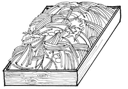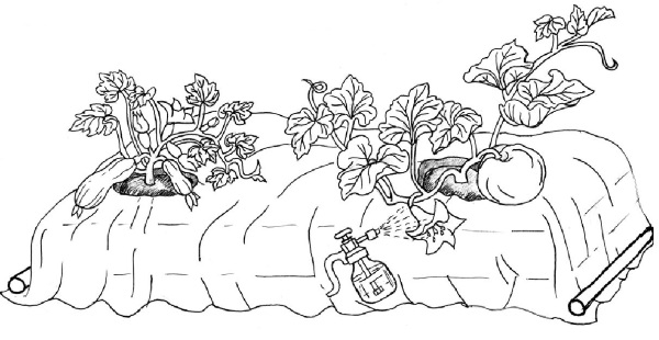 Тыкву лучше сеять на прошлогодней расположенной на солнце компостной куче (рис. 40), сделав в ней углубления. Если стоит сухая погода, то в каждую лунку вылить по пол-литра теплой воды, на глубину 5–6 см посеять по 2 семечка в лунку и накрыть всю кучу пленкой (рис. 41, 42). Сеять можно очень рано. На Северо-Западе, например, это можно сделать уже в первых числах мая. Компостная куча начнет перегнивать и давать тепло корням тыквы, растение начнет быстро развиваться. Как только растения дорастут до пленки, надо вырезать в ней отверстия и выпустить их наружу (рис. 43). Если стоит холодная погода (ниже 16–18 градусов) или сохраняется угроза ночных заморозков, то над растениями надо поставить дуги и накрыть их двойным спанбондом. Накрывать дуги пленкой не рекомендуется – при сильной жаре днем растения могут под пленкой «сгореть». При посадке на компостной куче за все лето не потребуется ни подкормки, ни полива, за исключением длительной засухи. Во влаге у тыквы потребность небольшая. В этом случае воду подливают под каждое растение из чайника в отверстие в пленке. Пленку с кучи не снимают все лето. При таком способе выращивания пленка защитит почву от излишка влаги в дождливую погоду и сохранит тепло и влагу в зоне корней. При по садке тыквы нужна довольно большая площадь питания – расстояние между растениями 1,2–1,5 м. Для лучшего оплодотворения опрыскивать цветки и бутоны раствором препарата «Завязь» или «Бутон» (рис. 44).