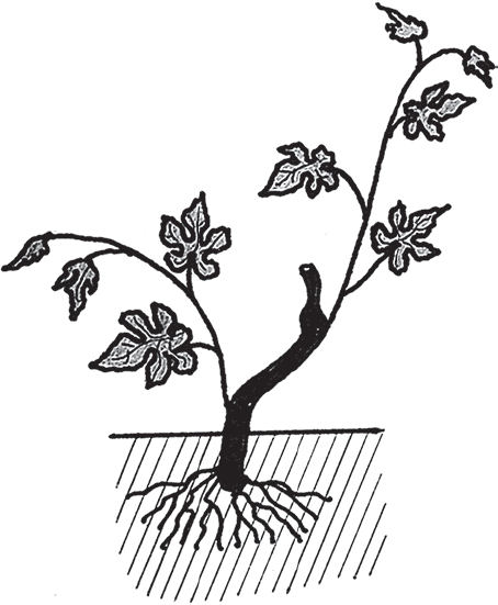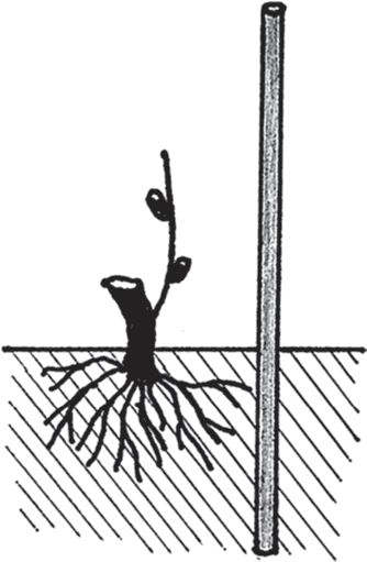 Высаженный весной саженец успевает за лето вырасти и вызреть, а в нижней части хорошо одревеснеть, но в середине-конце августа верхушечную точку роста надо все же выщипнуть (над 8–10-м листом), чтобы приостановить дальнейший рост лозы. В дальнейшем для наглядности на рисунках не изображаются листья, а только почки. Перед укрытием на зиму надо сделать обрезку лозы, оставив всего две почки (рис. 18). На зиму надо сделать сухое укрытие, такое же, как для роз.