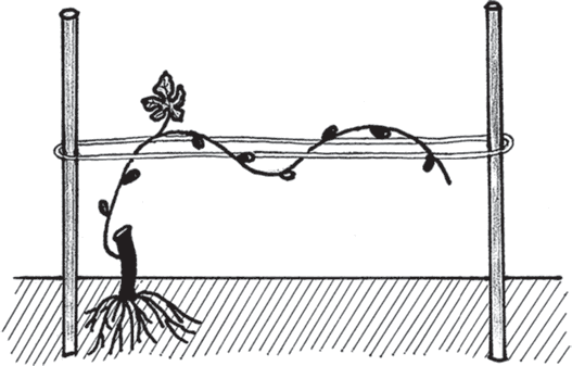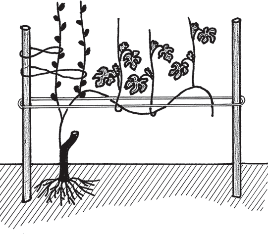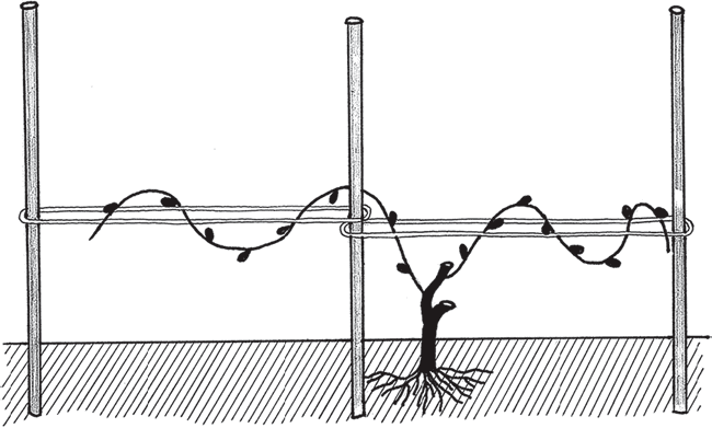 ВеснаНо теперь вы уже усвоили принцип работы, а потому можете оставить два ближайших к основанию побега замещения, либо растить две горизонтальные лозы, сделав дополнительную шпалеру на расстоянии 40–50 см над первой (то есть два «рукава» в одну сторону), либо развернуть «рукава» в разные стороны, вбив еще одну трубу и подвязав шпалеру (рис. 15, 16).