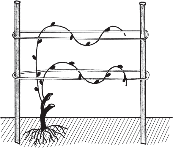 Седьмой этапВесной третьего года, как и во все последующие годы, укрытие надо снять и высыпать по стакану золы на почву под куст. До этого мы обходились без шпалеры, а теперь пришло время ее установить. Шпалера – это пара прочных столбов (лучше из вбитых в землю металлических труб на глубину не менее 80 см), на которые горизонтально натянута проволока (лучше в пластиковой оболочке) через каждые 25–30 см. «Рукава» раскладываем и подвязываем по этим проволокам, на каждой по одному. Получатся две плети на двух проволоках справа, две – слева.
