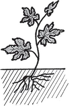 У винограда в самом верхнем слое почвы постоянно образуются корни-росянки (рис. 32), от которых надо регулярно куст дважды за лето освобождать (о вреде корней-росянок было написано в начале книги). Для этого надо отгрести почву от основания куста на глубину 2–3 см и выщипать или вырезать сочные ярко-красные корни-конкуренты. Корни-росянки легко образуются на «рукавах»-лозах, касающихся земли. Их тоже надо удалять.