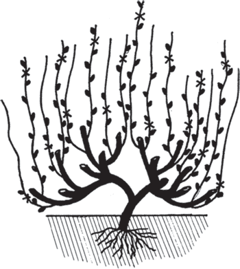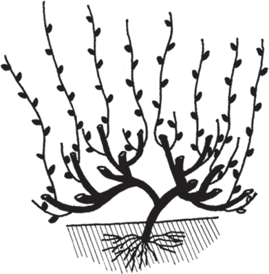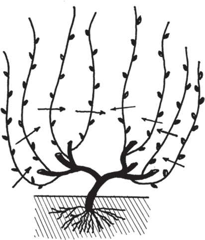 После обрезки должно остаться 4 толстых горизонтальных рукава, на каждом из которых остались по одному (или два) коротенькому (с 5–6 почками) молоденькому побегу замещения. Так куст должен выглядеть после обрезки каждый год. С возрастом только рукава становятся толще. Постепенно от года к году начинаем увеличивать нагрузку на куст, оставляя на побегах замещения не 5–6 почек, а 7–12.