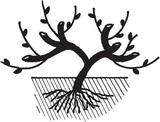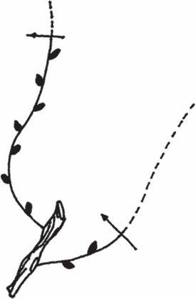 Весной третьего года на каждом «рукаве» уже образуется по две лозы (рис. 21), из которых внутренние будут «рукавами» второго порядка.