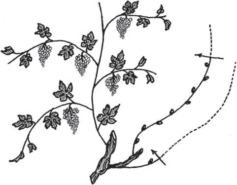 Рис. 29. Лоза, оставленная с 8 почками на плодоношение будущего года, и сучок замещения (лоза, обрезанная на 2 почки)