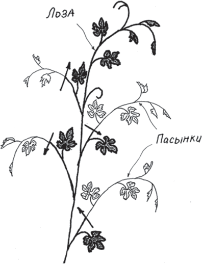 Пасынки, которые появляются из пазухи неплодоносящей лозы, не участвующей в создании урожая будущего года, следует постоянно убирать с самого момента их появления (аналогично тому, как вы поступаете с томатами), начиная с конца июня и до конца августа, чтобы уменьшить «лишнюю» зеленую непродуктивную массу куста. Если вы прозевали, и пасынок уже подрос, то чтобы пасынок не начал расти повторно, надо оставить на нем самый нижний лист (рис. 30).