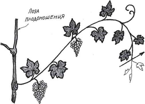 Рис. 31. Вершкование плодоносящей лозы после появления усика