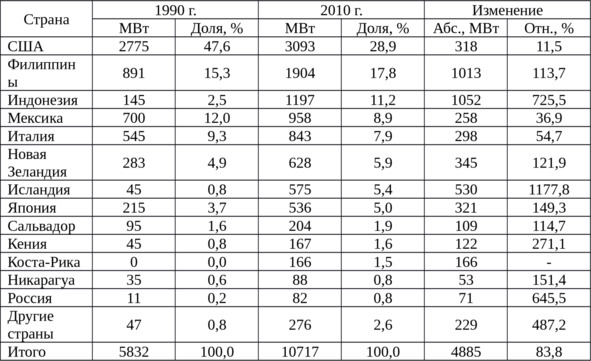 Установленная мощность геотермальных электростанций по странам мира за 1990—2010 г. отражена в таблице ниже.