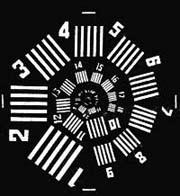 Разрешающая сила, или разрешающая способность объектива – показатель способности объектива воспроизводить в изображении мельчайшие детали объекта. Мелкие детали объектов фотографирования очень разнообразны по конфигурации и по контрасту с окружающим фоном, поэтому для сравнения объективов друг с другом применяют стандартный тест-объект, или миру (рис. 1.4.3.).