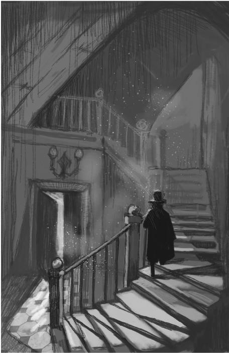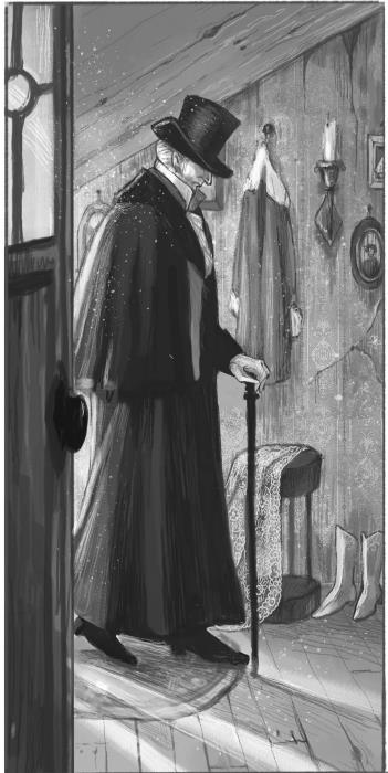 Фыркая, дети прячутся за сундук с розовым кустом. Дверь открывается, и в комнату входит высокий седой человек в черном сюртуке. На лацкане сюртука сверкает большая серебряная медаль. Он, важно подняв голову, оглядывается.