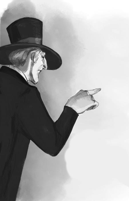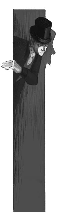 Человек достает из бокового кармана сюртука лорнет. Разглядывает брезгливо детей.
