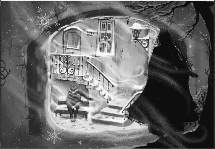Сказочник. Ну, тогда, значит, вы заслужили интересную историю. Слушайте. (Начинает рассказывать сначала спокойно и сдержанно, но постепенно, увлекаясь, принимается размахивать руками. В одной руке у него грифельная доска, в другой грифель.) Было это давно, очень давно. Мама моя, так же как и ваша бабушка, каждый день уходила работать к чужим людям. Только руки у моей мамы были не золотые, нет, совсем не золотые. Она, бедная, была слабенькая и почти такая же нескладная, как я. Поэтому кончала она свою работу поздно. Однажды вечером она запоздала еще больше, чем всегда. Сначала я ждал ее терпеливо, но когда догорела и погасла свечка, то мне стало совсем невесело. Приятно сочинять страшные сказки, но когда они сами лезут тебе в голову, то это уж совсем не то. Свеча погасла, но старый фонарь, что висел за окном, освещал комнату. И надо вам сказать, что это было еще хуже. Фонарь качался на ветру, тени бегали по комнате, и мне казалось, что это маленькие черненькие гномы кувыркаются, прыгают и только об одном и думают – как бы на меня напасть. И я оделся потихоньку, и замотал шею шарфом, и бегом выбежал из комнаты, чтобы подождать маму на улице. На улице было тихо-тихо, так тихо, как бывает только зимой. Я присел на ступеньки и стал ждать. И вдруг – как засвистит ветер, как полетит снег! Казалось, что он падает не только с неба, а летит от стен, с земли, из-под ворот, отовсюду. Я побежал к дверям, но тут одна снежинка стала расти, расти и превратилась в прекрасную женщину.
