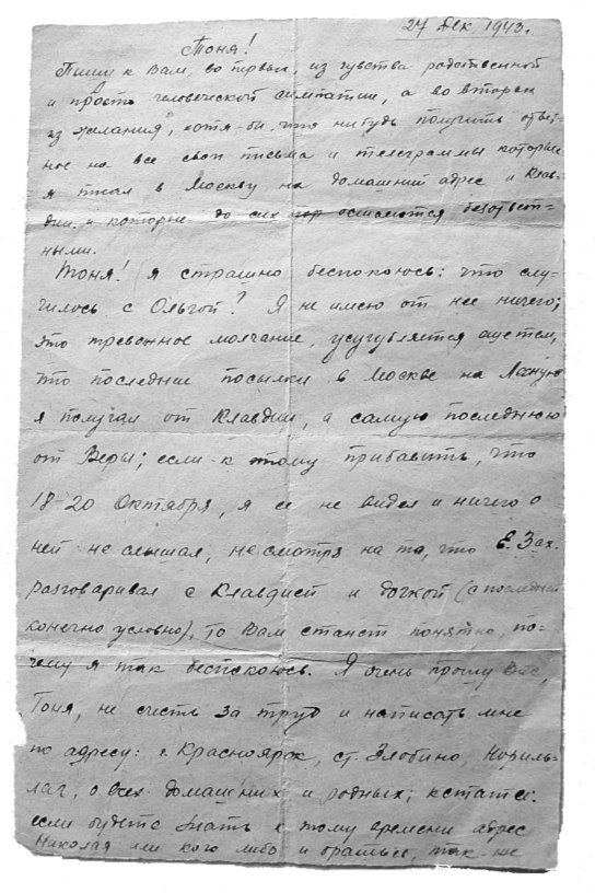 Письмо Андрея Старостина из НорильЛага (Норильский исправительно-трудовой лагерь) Антонине Андреевне, жене Н. П. Старостина (старшего брата). 1943