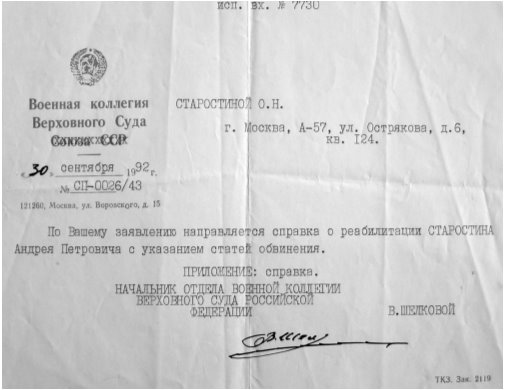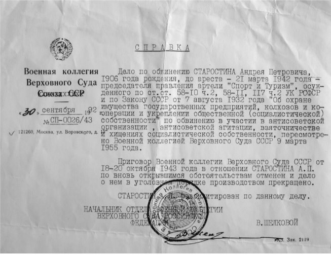 Справка о реабилитации Андрея Старостина