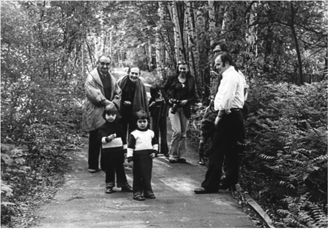 В. А. Катанян, Л. Брик, Н. Занд, Е. Табачников, И. Фишер, Володя и Антон Табачниковы. Прогулка по улице Павленко в Переделкине