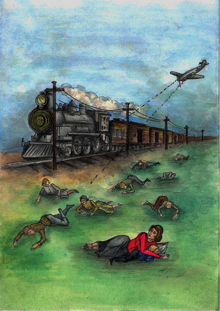 Артисты быстро выпрыгивали из вагонов, отбегали от них подальше и падали в первые попавшиеся углубления. Мама со Светой так быстро выбраться из вагона не могла, она замешкалась. На помощь ей пришел Дмитрий Васильевич. Бежать в поле уже не имело смысла, так как буквально сверху на нас свалились два немецких истребителя с черными крестами на фюзеляже, поливая из пулеметов лежавших вдоль поезда пассажиров. Мы упали в кювет около железнодорожной насыпи. Мама пыталась одной рукой не только прижать к себе и Свету и меня, но еще и прикрыть мою голову.