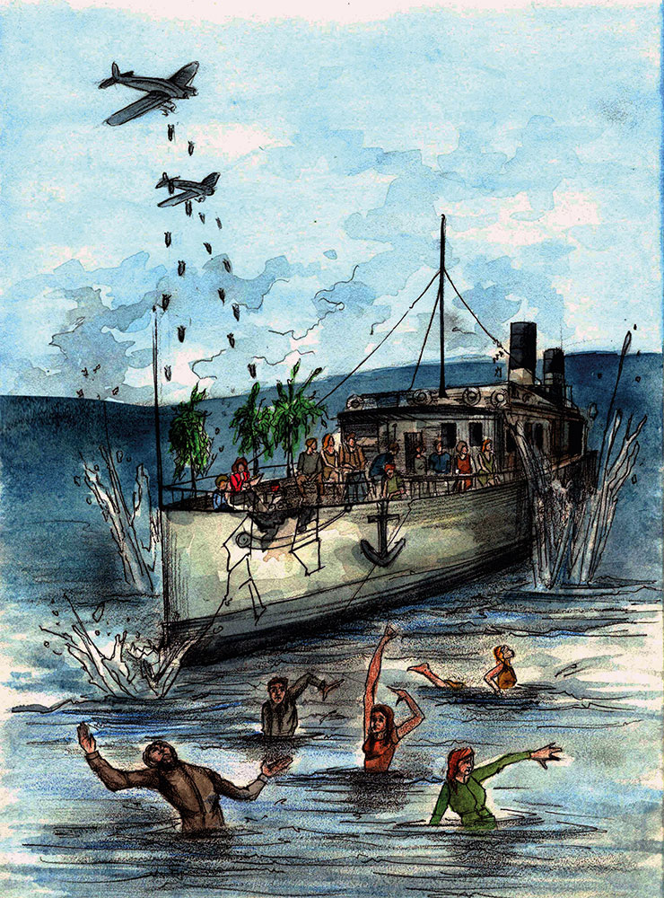 Когда самолеты улетали, пароход, с трудом отрываясь от приютившего его берега, продолжал свой путь. Пассажиры приходили в себя, отряхивались от воды и молили Бога, чтобы такое больше не повторилось. Некоторые считали, что немцам не удалось потопить пароход, потому что капитан был заговоренный. Так это было или не так, но многим хотелось в это верить.