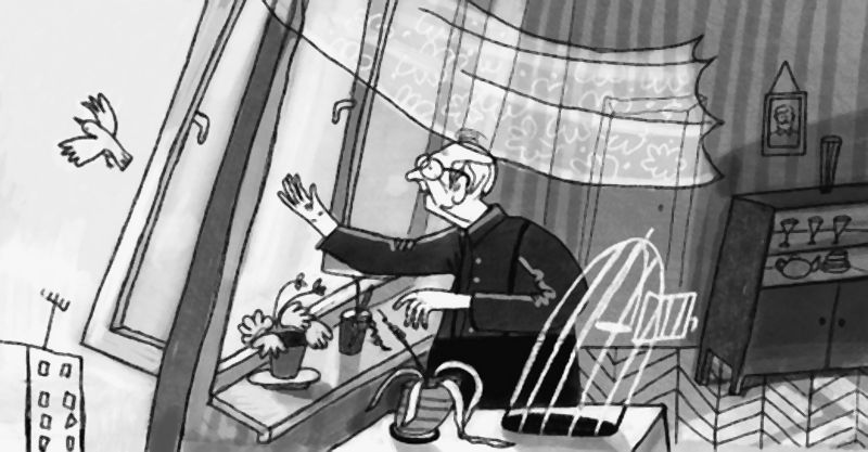 Он прощает птицу за непонимание. И бабку прощает за то, что пилила его вчера: птица, мол, испачкала скатерть. И внучку нерадивую, которой каждый раз напоминать надо, чтоб в доме прибралась, он прощает. Солнце светит, и ему хорошо. Ой, хорошо! Тело становится лёгким, и кажется, он может подняться вверх, к птицам.