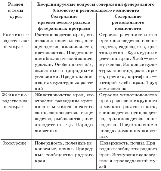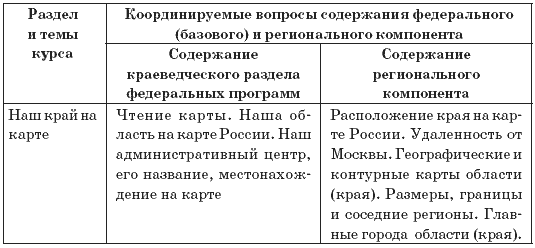 1) распределение и локализация регионального материала в отдельных темах при родоведческих курсов, содержащих краеведческие разделы;