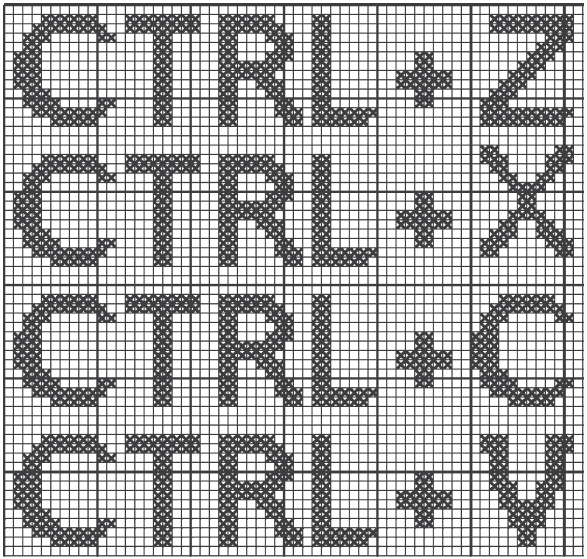3. На канве необходимого размера (выбранный рисунок и прибавка в 5 клеток с каждой из сторон) вышейте обычным полным крестом рисунок по схеме (рис. 155). Используйте нитки мулине в два сложения (из шести ниток пасмы выделите две и вышивайте ими). Нужный кусочек канвы разметьте смывающимся маркером, вырежьте его из общего полотна уже после завершения вышивки. Для каждой из кружек выполните отдельную надпись – одну из четырех, предложенных на рисунке.