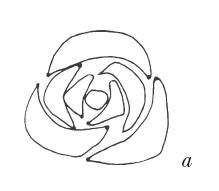 9. Вышейте рисунок лентами. Для листочков, которые необходимо вышить первыми, потребуются одиночные прямые стежки. Розочки вышивайте по намеченные кругам, начиная с внешнего периметра круга: петлеобразные стежки закручиваются по спирали (рис. 162, а) и закрепляют стежки предыдущего ряда в выпуклом положении, наслаиваясь на них. Последний стежок выполните в центре розочки, этот стежок представляет собой французский узелок из ленты.