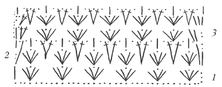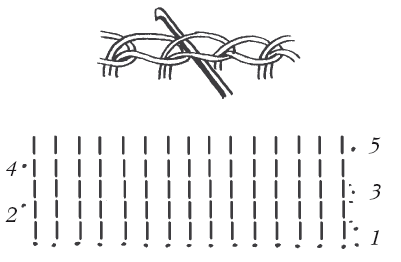 Выполняется столбиками с накидом. 1-й ряд провязать столбиками с накидом по одному на каждой петле цепочки. При вязании столбиков 2-го ряда вводить крючок под столбики предыдущего ряда справа налево то спереди, то сзади. Получатся выпуклые и плоские столбики, чередование которых в узоре опять-таки напоминает вязание на спицах. Вязать все нечетные столбики выпуклыми, а четные – плоскими. Закончив 2-й ряд вязания, повернуть работу наизнанку, связать 2 воздушные петли вместо 1-го столбика и выполнить 3-й ряд, следя за тем, чтобы выпуклые столбики 3-го ряда были расположены над выпуклыми столбиками 1-го ряда, а плоские – над плоскими.