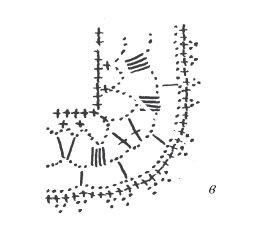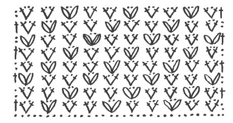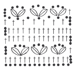 Выполняется из сочетания различных элементов. 1-й ряд вывязать столбиками с накидом. 2-й ряд – «рогатки» из листиков (рис. 44). В листике 3 недовязанных столбика с накидом, между листиками «рогатки» – по 3 воздушные петли. Между «рогатками» пропускать по 3 петли. 3-й ряд вязать столбиками с накидом, по 3 столбика под каждую цепочку и по одному столбику между «рогатками». 4-й ряд вязать столбиками с накидом по одному на каждом столбике предыдущего ряда. 5-й ряд вязать столбиками с накидом на каждой 2-й петле основания, между столбиками 1 воздушная петля – «решетка». 6-й ряд вязать «рогатками» из листиков, вводя крючок под каждую 2-ю воздушную петлю. 7-й ряд вязать как 2-й. 8-й ряд – как 3-й. В узоре листики выполнять с лицевой стороны вязания.