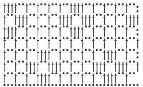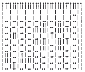 Также выполняется столбиками с накидом. 1-й ряд провязать так же, как и в предыдущем узоре – столбиками с накидом по одному на каждой петле основания. 2-й ряд выполнять так: 3 столбика выпуклых, 3 плоских и т. д. Повернув работу, столбики 3-го ряда выполнять так, чтобы выпуклые располагались над выпуклыми, а плоские – над плоскими. В 4-м и 5-м рядах выпуклые столбики расположить в шахматном порядке по отношению к выпуклым столбикам 2-го и 3-го рядов.