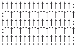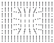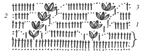 Выполняется бугорками и столбиками с накидом. Через каждые 7 столбиков с накидом вяжут мотивы бугорков. В каждом новом ряду мотив бугорков продвигают в правую сторону на 2 столбика (рис. 49).