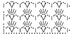 3-й ряд: 3 столбика без накида под воздушные петли «кустика», между столбиками по 1-й воздушной петле, между «кустиками» – 4 воздушные петли. «Рогатка» из 2-х столбиков с накидом и 2-х воздушных петель между ними на 4-й петле цепочки, 4 воздушные петли.