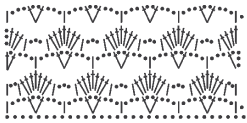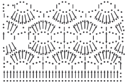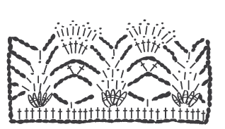 Узор для оборки вывязывают 9-ю столбиками из одной петли, столбики разделяют между собой столбиками без накида. Расстояние между «ракушками» разделяют по схеме от центральной петли по 4 петли в обе стороны.