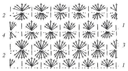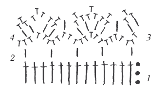 4-й ряд: по 2 столбика без накида под воздушные петли «кустика», между столбиками – по 1-й воздушной петле, между «кустиками» – 4 воздушные петли, 5 столбиков с накидом и по 1 воздушной петле между ними (веер) под цепочку каждой «рогатки», 4 воздушные петли.