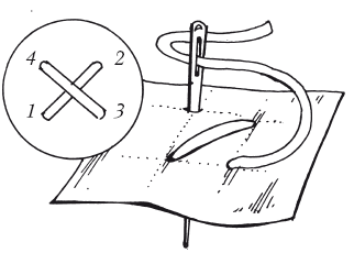 Восьмеркообразным швом (рис. 79) можно заполнять такие элементы вышивки, как лепестки цветков и листики. Особенностью такого шва является то, что поверхность узора заполняется не слишком плотно прилегающими друг к другу перекрещивающимися стежками.