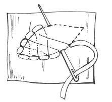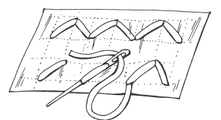 Интересно, что таким швом одновременно и заполняют узор, и обводят его контур. Принцип выполнения этого шва состоит в том, что обшивают контур узора швом «назад иголку». Но сделав один такой стежок, перекидывают рабочую нить на изнанку к противоположному краю для того, чтобы получить такой же стежок. Вновь перекидывают с изнаночной стороны нить к противоположному краю и т. д. Следят за тем, чтобы стежки получались одинаковой длины.
