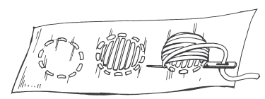 Штопальной иглой или спицей протыкают центр кружка – образуется небольшая дырочка. Далее иголкой с нитками для вышивки обметывают края дырочки швом «через край» так, чтобы стежки плотно прилегали друг к другу. «Дырочка» готова.