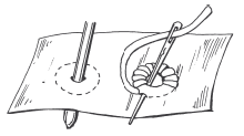 Техника выполнения «узелков» проста. Выводят рабочую нить на лицевую сторону вышивки. Затем обкручивают рабочую нить вокруг иголки (всего должно получиться два-три таких оборота) и вкалывают иголку в место, из которого выходит рабочая нить. Чтобы «узелок» не соскользнул, придерживают его пальцем. Такие узелки называют французскими.