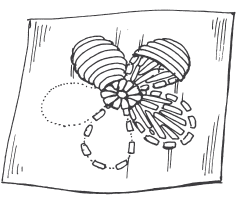 «Пышечка» (рис. 73). Этот прием чаще всего используют при вышивании круглых элементов узора. Начинают с того, что обшивают элемент узора по краям швом «вперед иголку» (стежки не должны быть слишком крупными). После этого выполняют настил: внутри самого элемента узора делают стежки в направлении сверху вниз. Сделав настил, принимаются за завершающий – декоративный – этап вышивки: плотно прилегающими друг к другу стежками, выполняемыми в направлении слева направо, заполняют узор. Получается «пышечка»: настил делает ее рельефной.