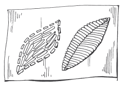 Впрочем, листики могут вышиваться по-разному. Мы рассказали о том, как вышивается обычный листик, а есть еще и листик «в раскол» (рис. 77). «В раскол» означает, что на определенном этапе работы элемент будет делиться на две части так, как показано на рисунке.