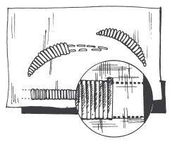 Гладьевой валик без настила (рис. 78) выполняют плотно прилегающими друг к другу параллельными стежками. В зависимости от того, что именно вы вышиваете, стежки валика можно располагать как с наклоном, так без наклона. Классический вариант гладьевого валика – валик с прямыми стежками на лицевой стороне вышивки и слегка скошенными – на изнаночной.
