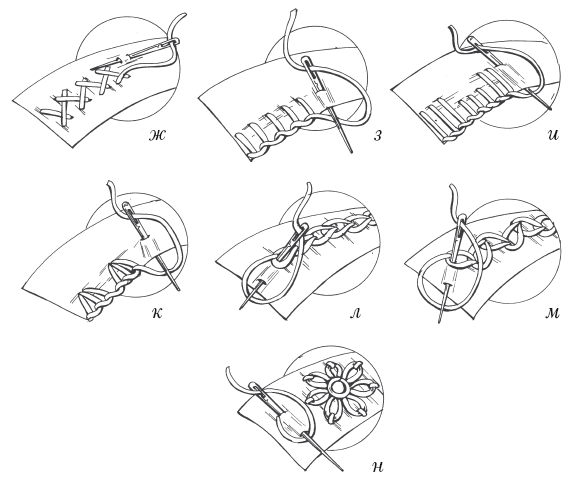 Рисунок 91. Контурные швы – основа вышивки гладью: а) «вперед иголку»; б) сплошной «за иголку»; в) прерывающийся шов «за иголку»; г) стебельчатый шов; д) шнурок витой; е) шнурок-спираль; ж) шов «козлик»; з) петельный шов; и) петельный шов с разной длиной стежков; к) петельный шов с группировкой стежков; л) прямой тамбурный шов; м) зигзагообразный тамбурный шов; н) простая петелька и цветок из петель