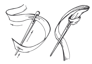 Шнурок (рис. 91, д, е) – шов, выполняемый в два этапа. Сначала делают стежки «вперед иголку», причем расстояние между стежками должно быть в два раза короче длины стежка. Второй этап – иглу с ниткой (иногда другого цвета) протягивают между тканью и стежками первого этапа.