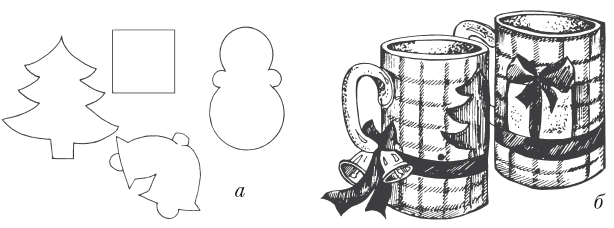 6. Из плотного зеленого фетра выкроите детали «подарок» и «елочка» (рис. 108, а), взяв высоту каждой детали вполовину высоты кружки (другие варианты украшений из фетра приведены на том же рисунке). Их можно вырезать из фетра белого, красного, бордового цветов.
